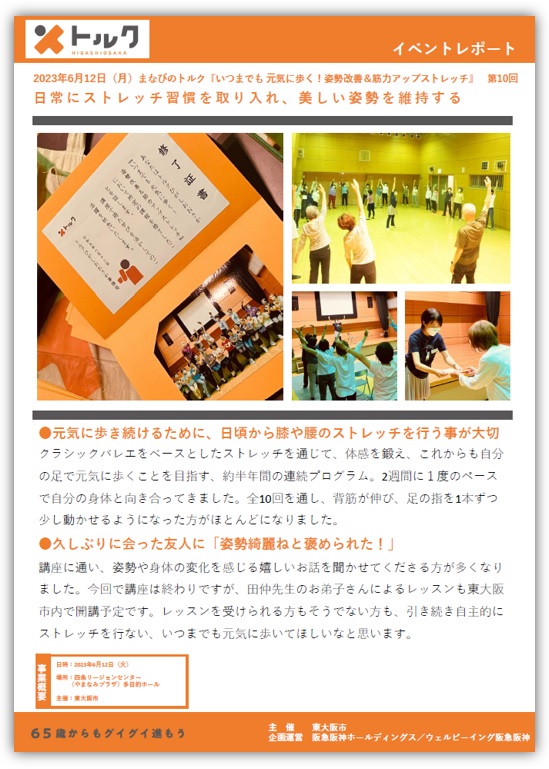 2023年6月12日(月)。クラシックバレエをベースとしたストレッチを通じて、体幹を鍛え、これからも自分の足で元気に歩くことを目指す、約半年間の連続プログラム。2週間に1度のペースで自分の身体と向き合ってきました。全10回を通し、背筋が伸び、足の指を1本ずつ少し動かせるようになった方がほとんどになりました。