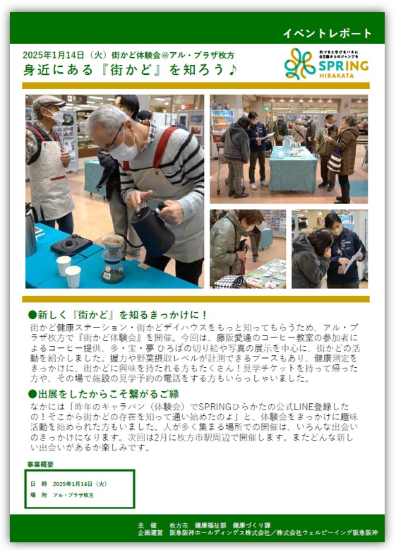 2025年1月14日(火)。街かど健康ステーション・街かどデイハウスをもっと知ってもらうため、アル・プラザ枚方で『街かど体験会』を開催。