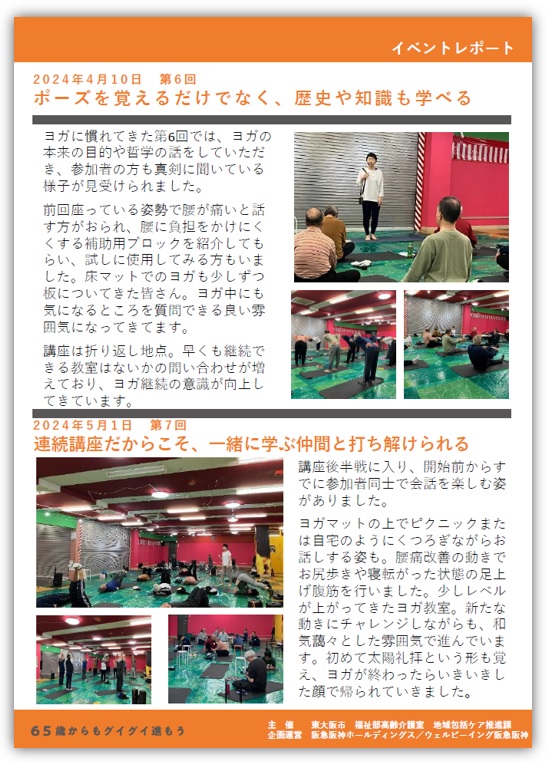 2024年4月10日(水)。ヨガに慣れてきた第6回では、ヨガの本来の目的や哲学の話をしていただき、参加者の方も真剣に聞いている様子が見受けられました。